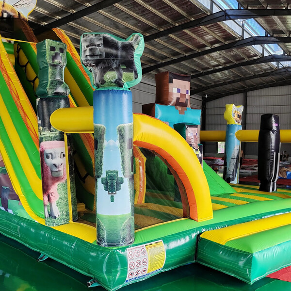 Oblíbená nafukovací atrakce s motivem Minecraftu přináší dětem spoustu dobrodružství, pohybu a zábavy! Díky známému světu plnému kostičkových postav a zvířat se děti mohou na chvíli stát součástí své oblíbené hry a užít si akční skákání i rychlou jízdu na skluzavce. Tato atrakce rozzáří každou dětskou oslavu, rodinný den, firemní akci nebo obecní slavnost. 🎉